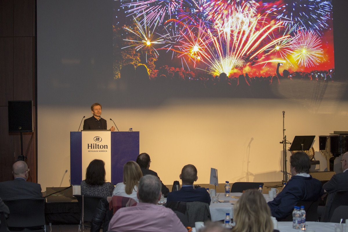 Forstjóri Nýsköpunarmiðstöðvar talaði um þær fjölmörgu áskoranir sem við stöndum frammi fyrir ef við Íslendingar ætlum að halda stöðu okkar í efnislegum gæðum. Eitt mikilvægasta verkefni okkar væri að nýsköpunarvæða íslensku þjóðina.